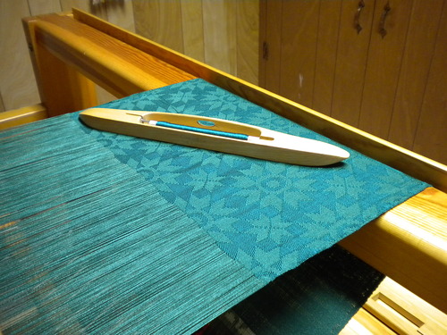 Last week, I put the draw attachment back on my Glimakra loom and rethreaded a damask warp, this one in forest green to grace holiday tables. I’m using a star pattern from an early coverlet which repeats for the length. The beauty of this damask threading is that I can change patterns at will and get a variety of designs on one warp.