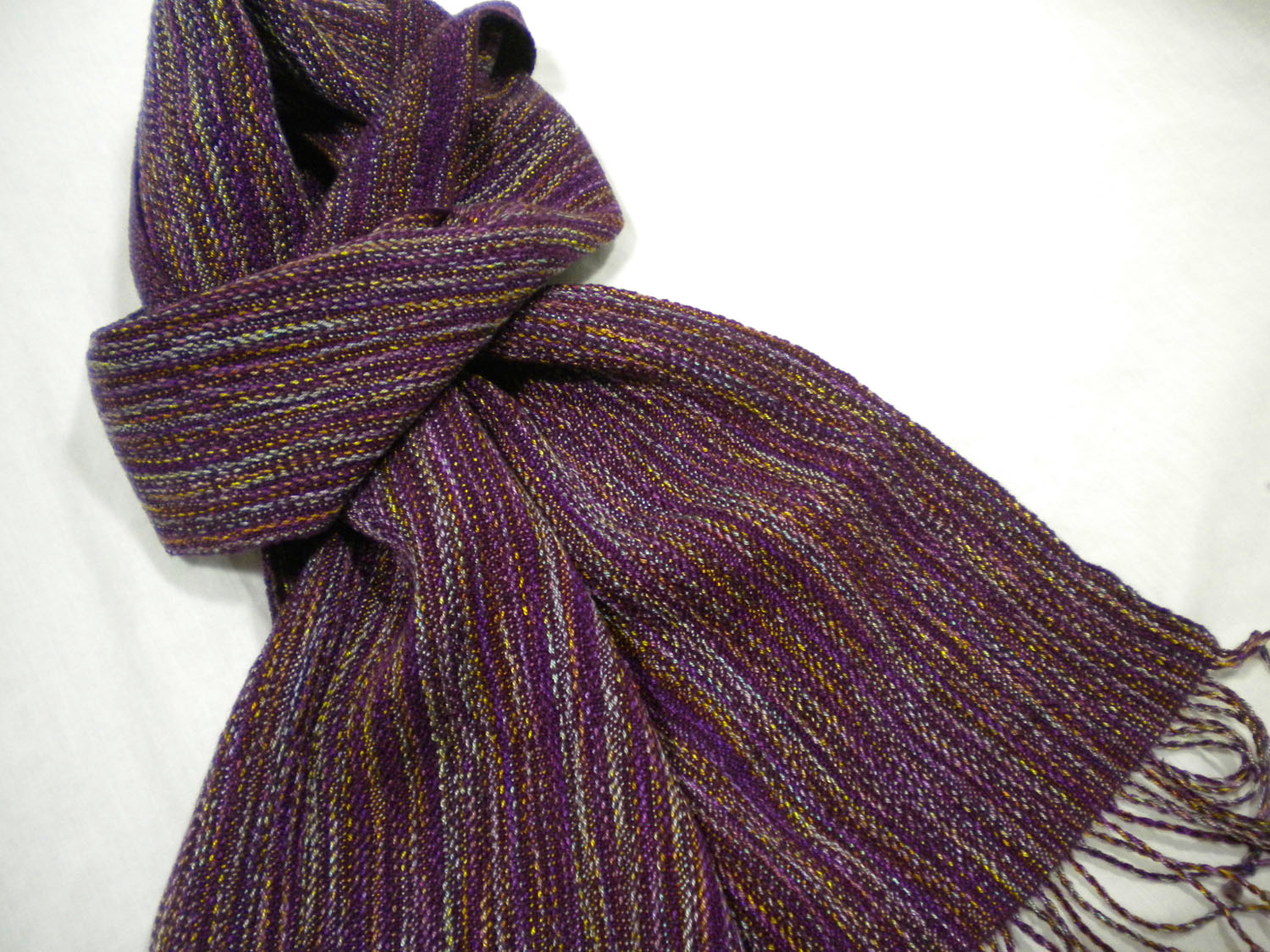 Twills are great for allowing a warp (the lengthwise yarn) to show up. Twills give us that distinctive diagonal line in weaves (think of your blue jeans). Tweak that a little by moving the twill line in segments and you have advancing twill. An advancing twill scarf in space-dyed Tencel just loves to snuggle around your neck. Take a look and tell me what you think! jeanweaves@gmail.comEggplant_Scarf