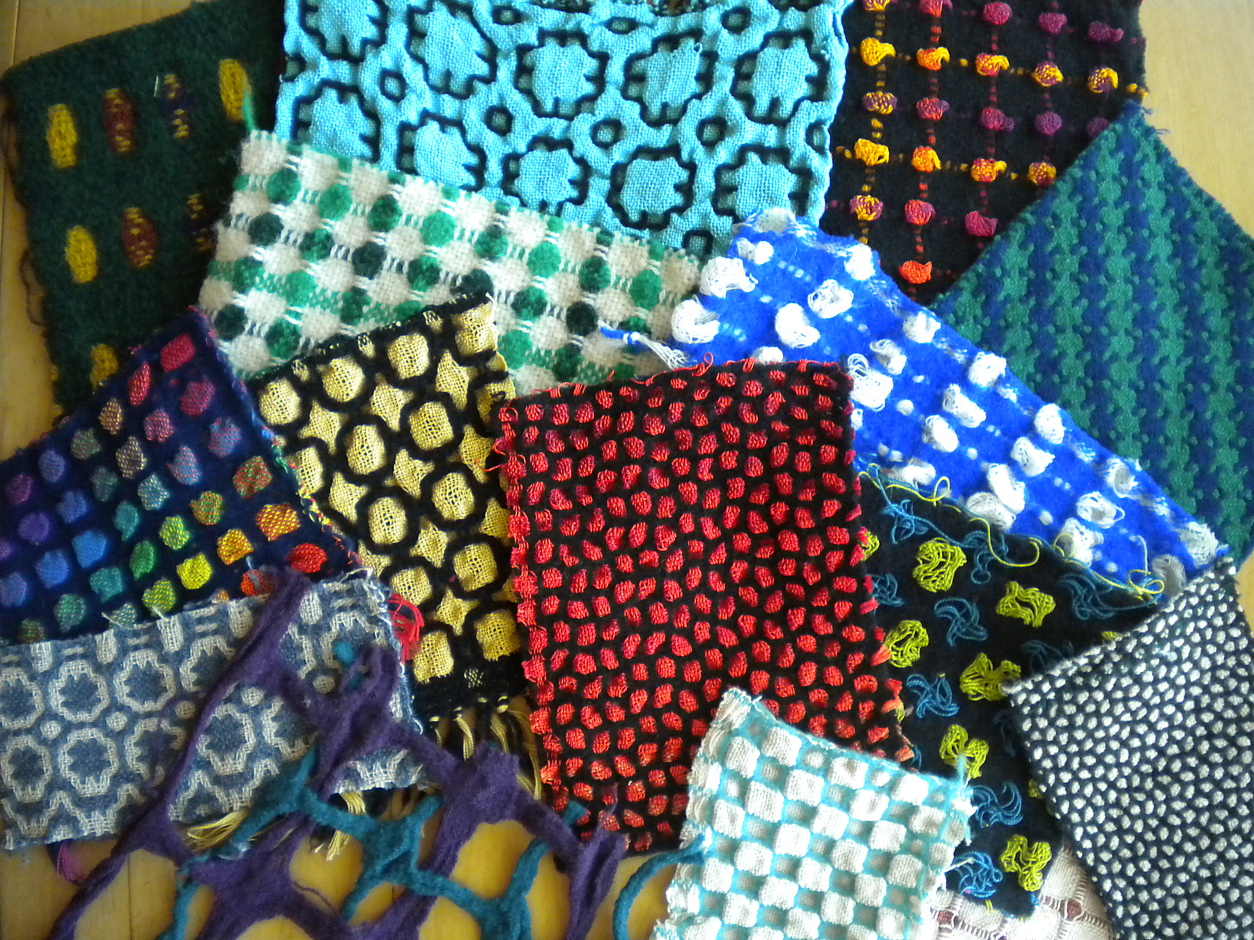 There were samples that looked like mosaics, lacy samples, and polka dot samples. Over and over, we heard to weave square. On some drafts, this meant to barely set the weft in. On other drafts, a normal beat was needed. The trick was to adjust my beat as I moved from a lacy sample to a firm sample. I didn’t always make the adjustment and my samples show it.