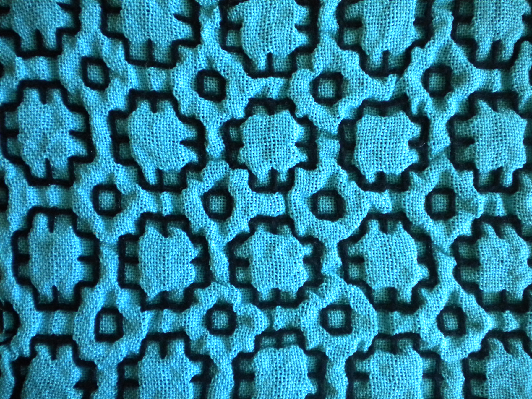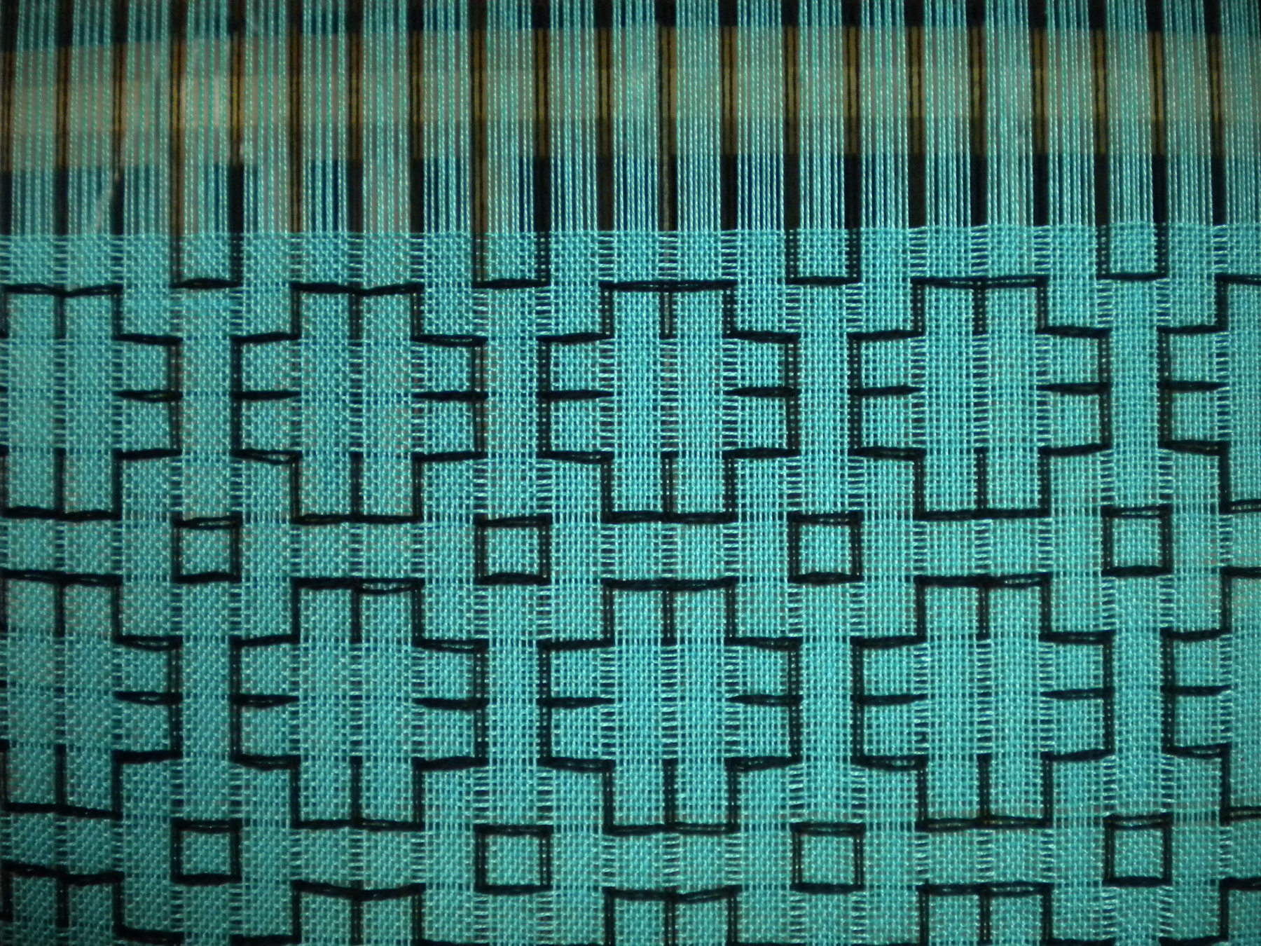 We each wove the first sample, cut it off, and washed it to see what the fabric would do. My draft used a fine wool with a 10/2 mercerized cotton. The wool shrunk, of course, which pulled the cotton areas together in puffy figures across the surface; fun! During the course of the weekend, we wove samples on each other’s looms and came away with 16 different examples of yarns doing strange things.