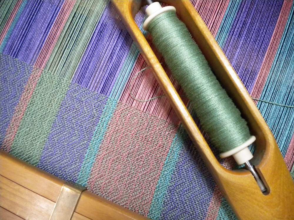 Recently I’ve been weaving workshop samples and neutral colors, and really, this week I needed some color. So I went to my shelf and started pulling out cones. Reds, purples, blues, peach, turquoise, green. Which should I choose? Which colors will play nicely together?