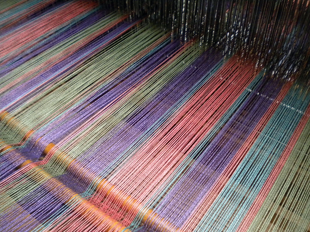 It takes the better part of a day to thread a broken twill that will make up a vibrant towel warp—I hope! Lots of time to wonder…