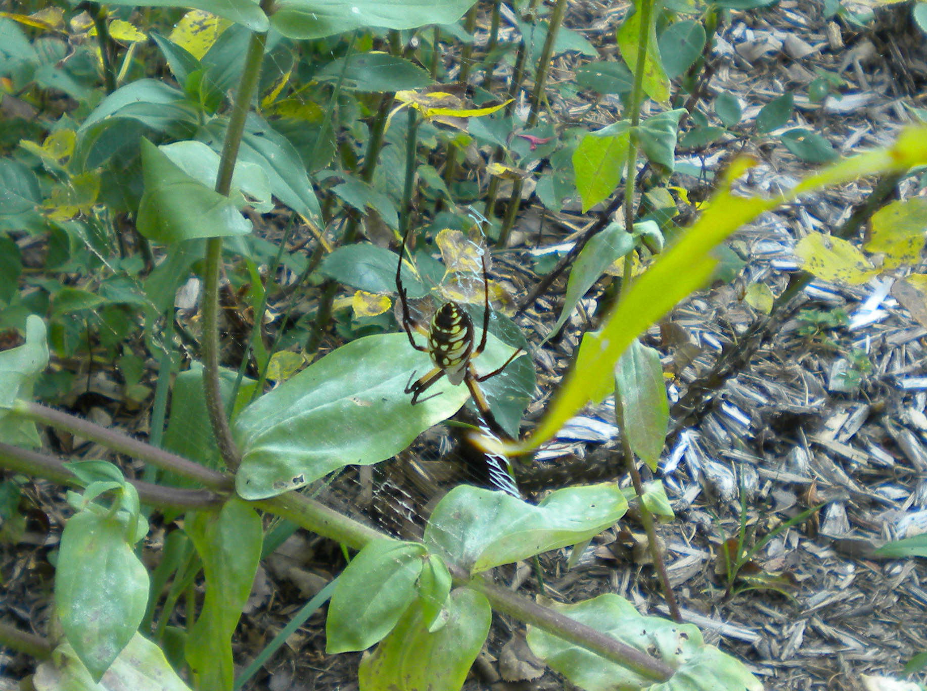She (he?) is really lovely in her own way. She must be 2” to 2.5” long and her web extends at least a couple feet from stem to stem. But at the same time, she makes me shudder. I have never seen a spider so big. Fall is on the way here in mid-Missouri and spiders have grown large over the summer months.