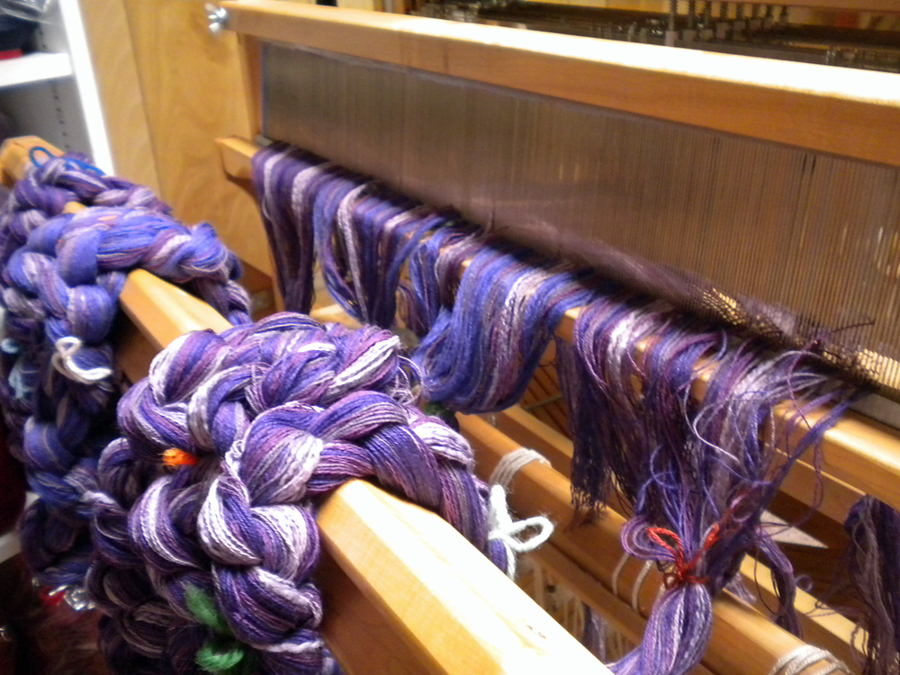 After the warp is threaded, it has to be wound onto the warp beam. Here is where I find out if I’ve inadvertently crossed any threads between the reed and the heddles. If I don’t have tangles, the winding on goes pretty quickly—about an hour or so, depending on the length of the warp. After I tie it onto the breast beam, spread the warp, and adjust the tension, I’m ready to weave. This is the fun part.DSCN1466