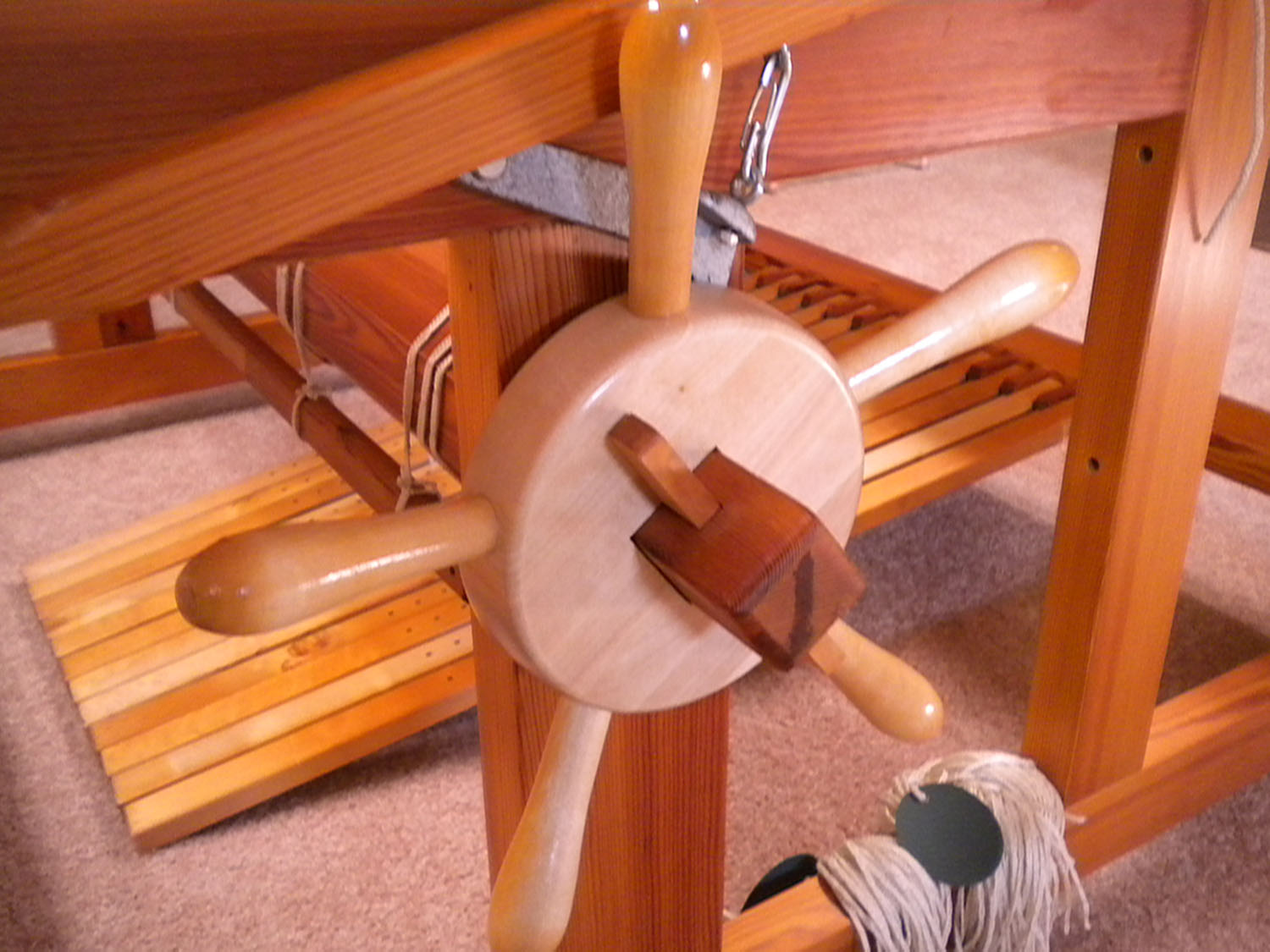 Yesterday, my kind husband helped assemble the frame and square it up. Then it got a second go-over with wood conditioner. The loom fairly glows now, although the wheel ratchets are a decidedly lighter color than the rest.