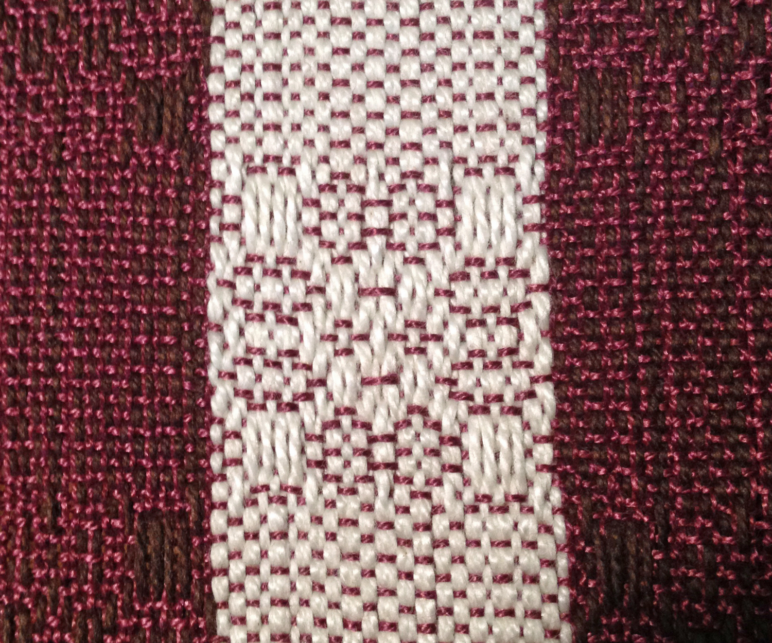 I checked the “usual suspects”— tie-up, treadling, threading. I enlarged the draft on the computer and that’s when I noticed that at the reversing point in the diamond, the weaving program had also reversed the tabby. On the loom, I had faithfully threaded all the ground threads on shafts 1 and 2, alternating all the way across. I should have reversed those ground threads as well as the pattern threads.