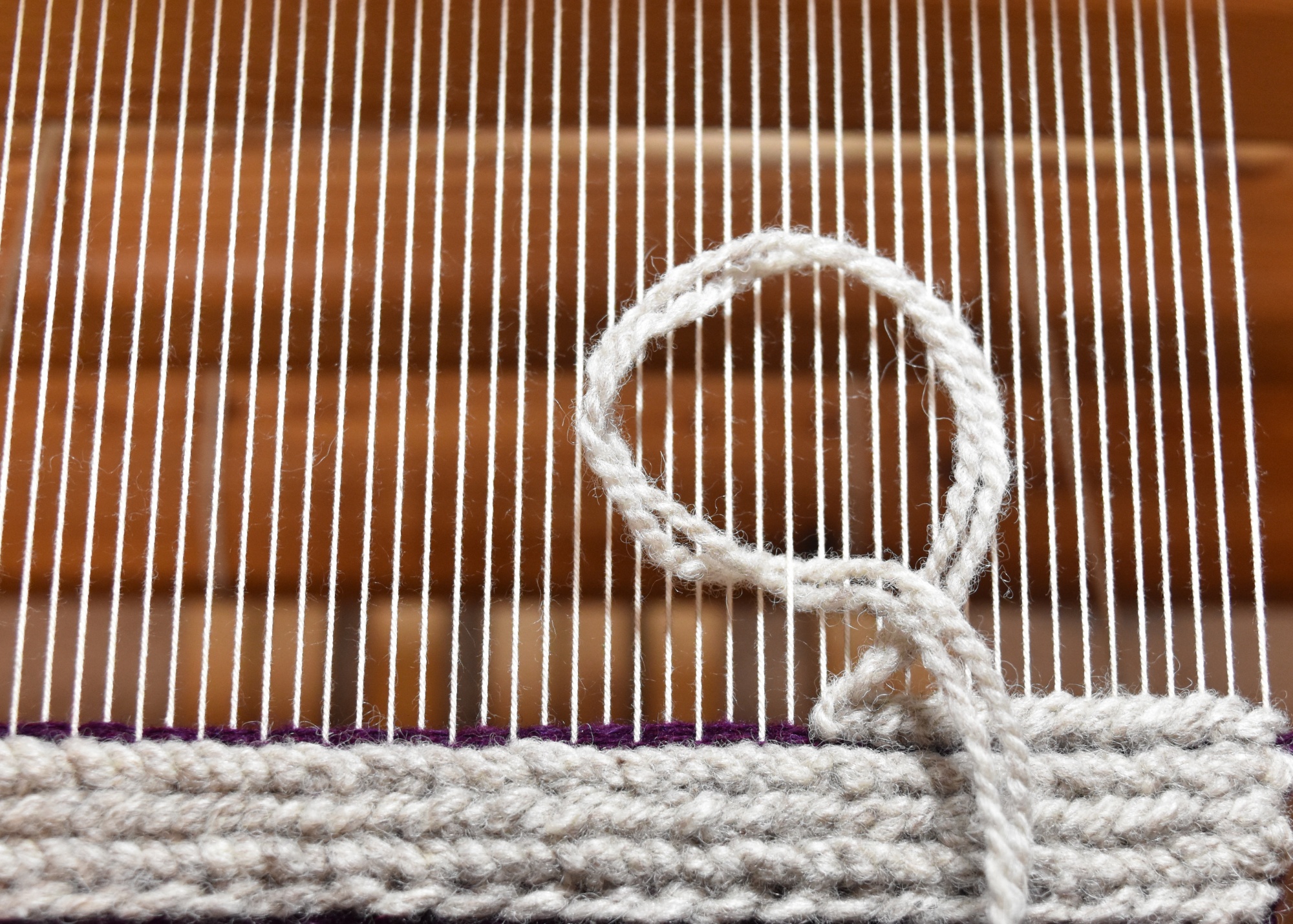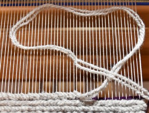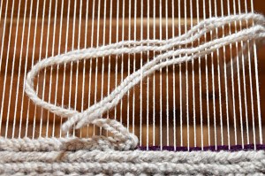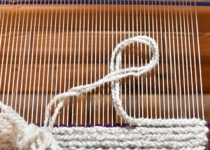 Going right to left went smoothly: forward over two warps, back under the 2nd one and then over the 1st one and snug it down, a figure-8. The row progressed well. Right up to the turn at the left edge, where I had to move the yarn up and start working left to right.