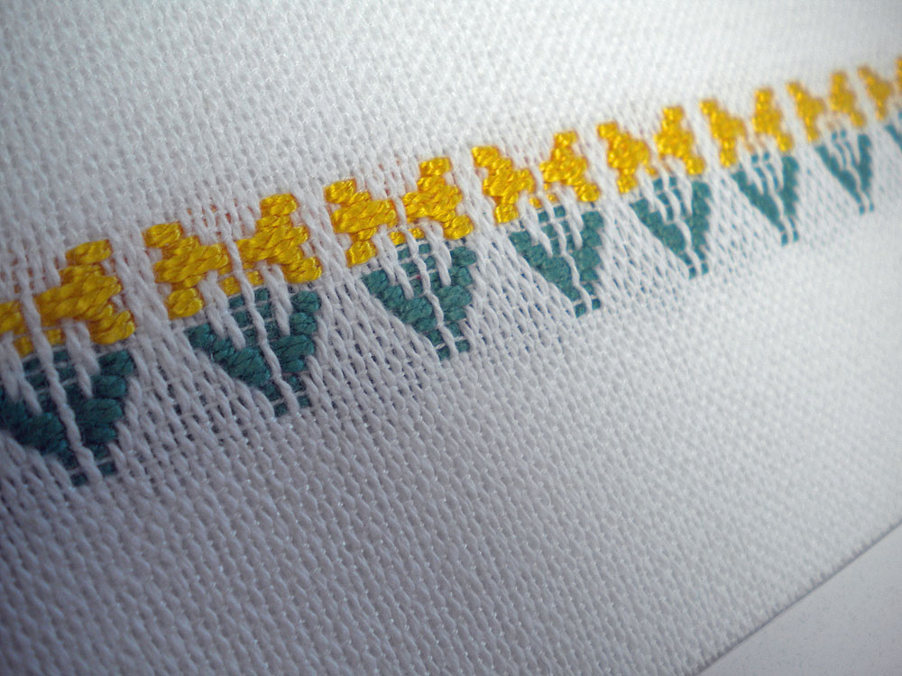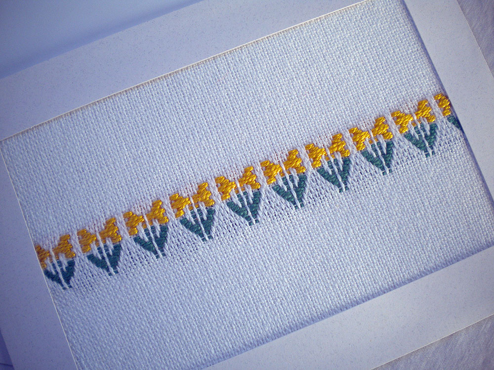 This 5” x 7” notecard holds a handwoven cotton panel of daffodils to brighten the day of your favorite someone. The daffodils are woven in bright yellow against a white, plain weave background, just like the spring flowers pop through the snow. The card is blank inside so you can personalize your greeting. Envelope is included. $10