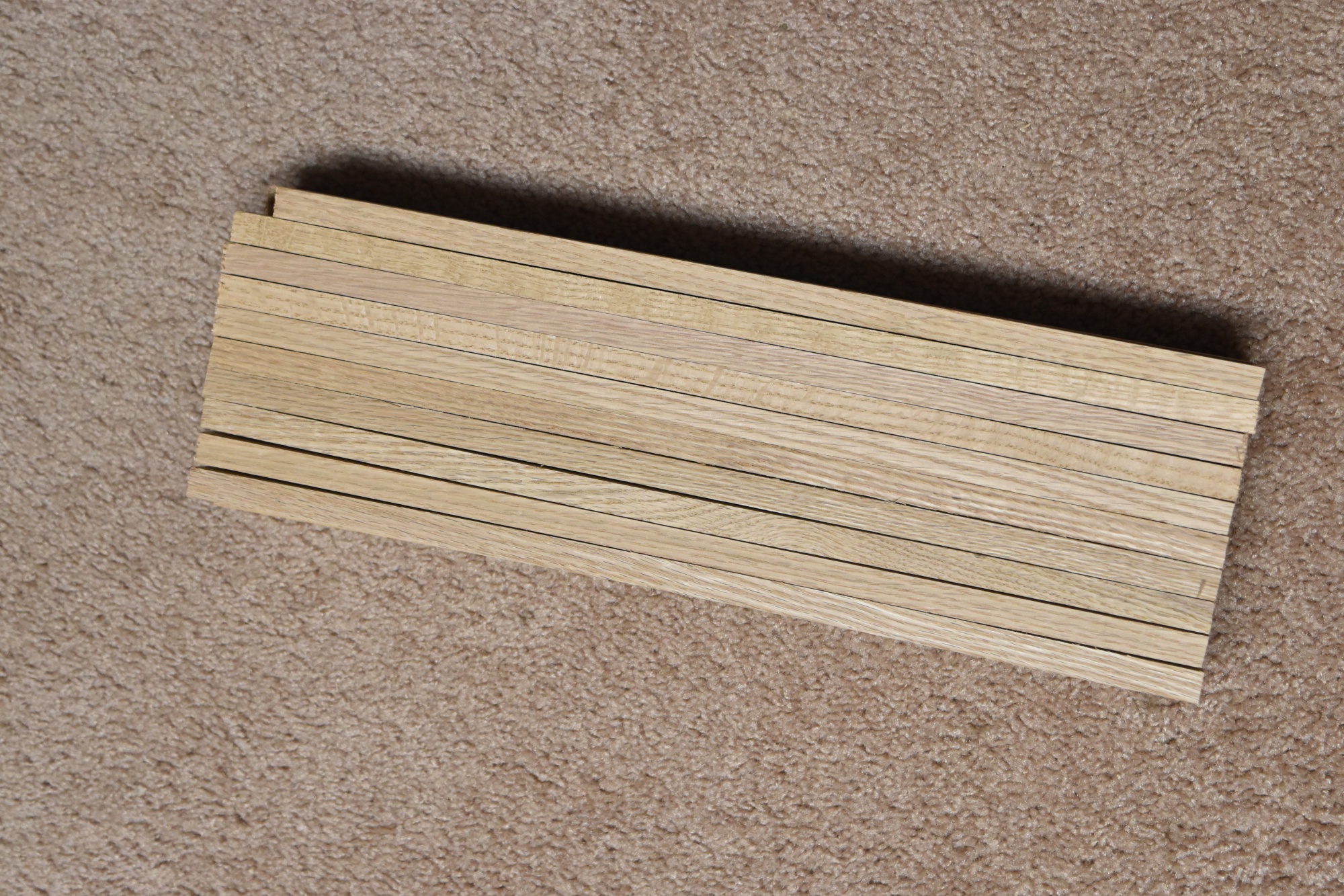 He also said it would be next to impossible to drill the upright holes straight without a drill press. We weren’t going to buy a drill press for just one project, but we did find an affordable drill guide. Then off to the lumber store for ½” x 1 ½” wood. Home again, we measured, cut, — and lo and behold, I mismeasured one of them. Back to the lumber store for one more piece.(Mis)measured wood