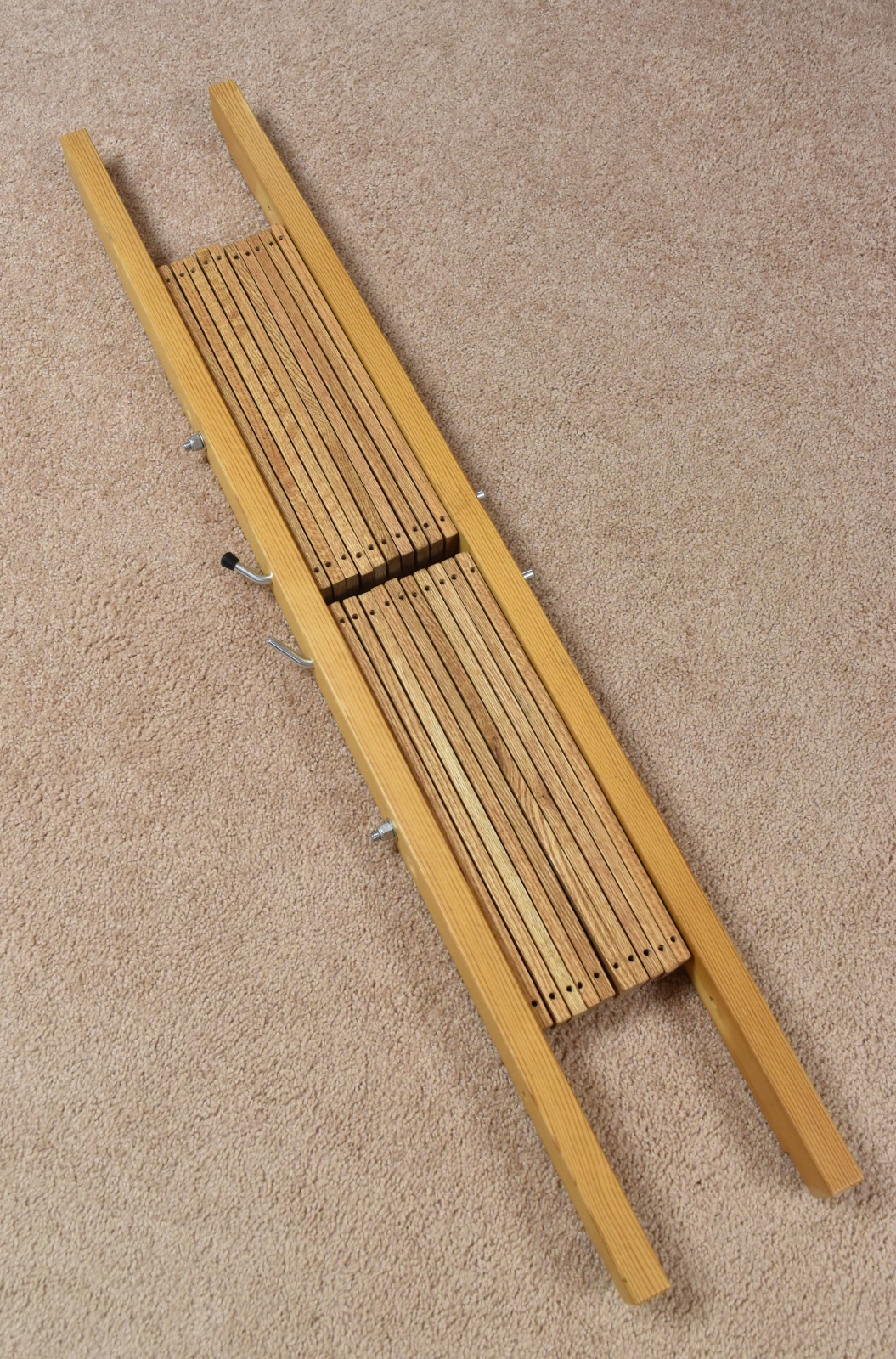 Next came the drilling. We had to drill a new pivot bolt hole in the countermarche frame to center the shorter jacks. Each jack needed a pivot hole in the center, two holes on either upright end for the cords, and a locking pin hole. I wanted to use the existing locking pin holes in the frame to avoid drilling into the frame more than needed.