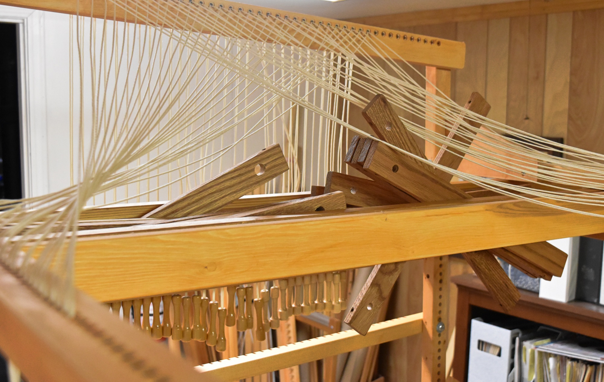 Now, thanks to my Dear Husband, the countermarche sits atop the loom, under the draw bridge, awaiting new warps. My mind is working.